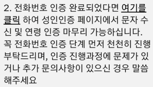 9. 다시 돌아와 2. 전화번호 인증 완료되었다면 여기를 클릭 하여 성인인증 페이지에서 문자 수신 및 연령 인증 마무리 가능하십니다."를 클릭합니다.