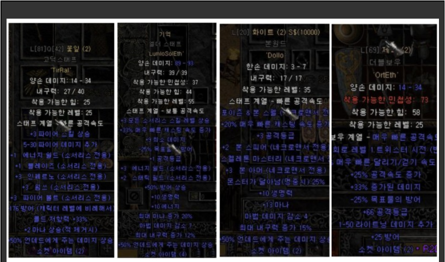 디아블로2 룬워드 템들은 레벨이 높아질수록 거의 사용을 하지 않습니다. 초반에 육성하실때만 잠깐 사용하시고, 후반으로 치닫을수록 앵벌용 룬워드 템들을 골라 사용하시면 된답니다.